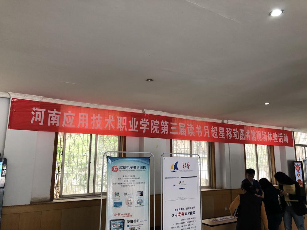 2018年4月24日下午,河南应用技术职业学院第三届读书月举办了电子资源现场体验活动,开展此项活动的目的是为了让更多师生全面了解和熟练使用图书馆购买的移动图书馆、读秀知识库和中国知网电子资源,体验现场分别设在图书馆办公楼一楼大厅、新实训楼501、505三个场地同时开展超星移动图书馆、读秀知识库、中国知网数据库的现场体验活动。