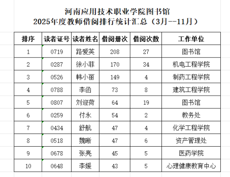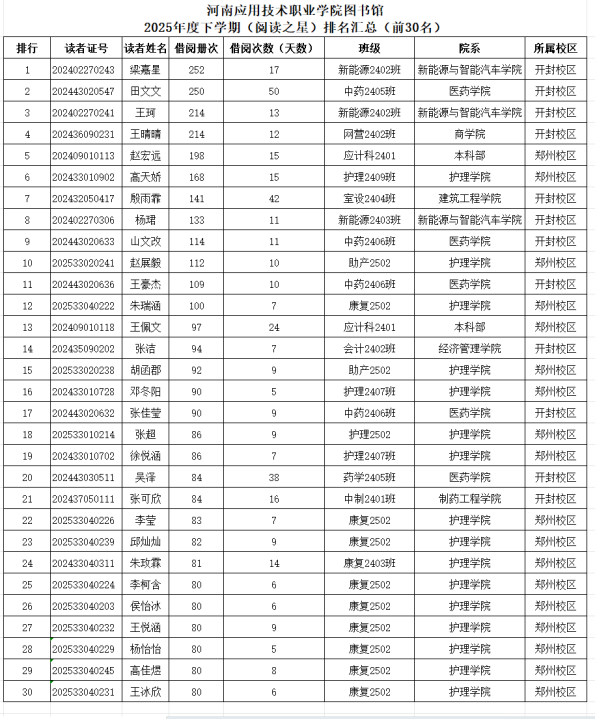 学生“阅读之星”崭露头角 在激烈的角逐中,新能源与智能汽车学院的梁嘉星同学以252册的借阅量荣登学生榜单首位,医药学院的田文文同学和新能源与智能汽车学院的王珂同学分别以250册和214册的借阅量紧随其后,展现出我校学子对知识的渴望和追求。