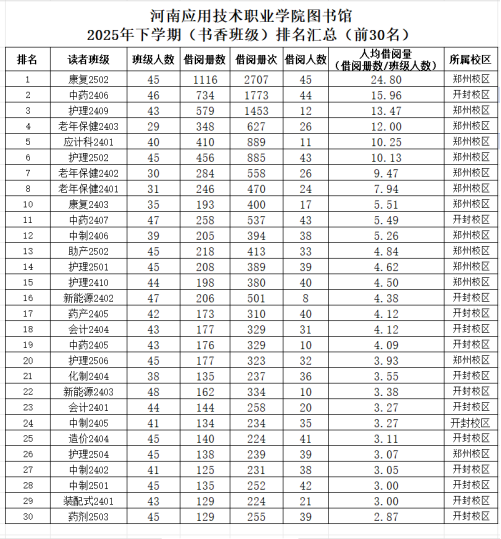 “书香班级”凝聚集体力量 康复2502班以人均24.8册的借阅量拔得头筹,中药2406班和护理2409班分别以人均15.96册和13.47册的借阅量位列第二和第三,充分展现了班级集体的阅读热情和良好的学风。